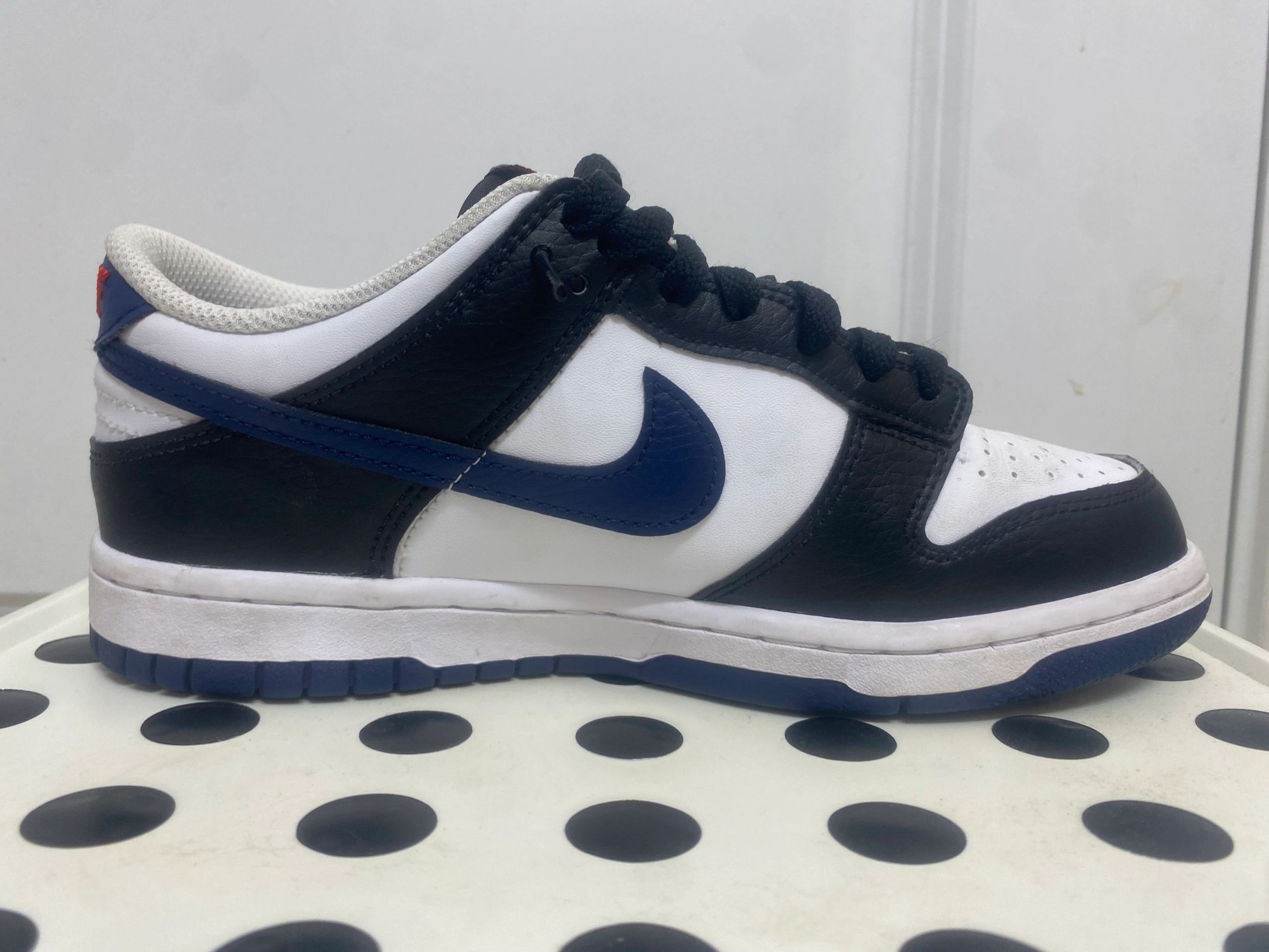 Lightly used Nike Dunk Low “Championship Navy” in boys’ size 5.5Y – worn only once and still in excellent condition. Features a clean white leather base with dark navy overlays and a bold navy Swoosh, inspired by the classic Georgetown colorway. Iconic Dunk styling with a comfortable low-top fit and durable rubber sole