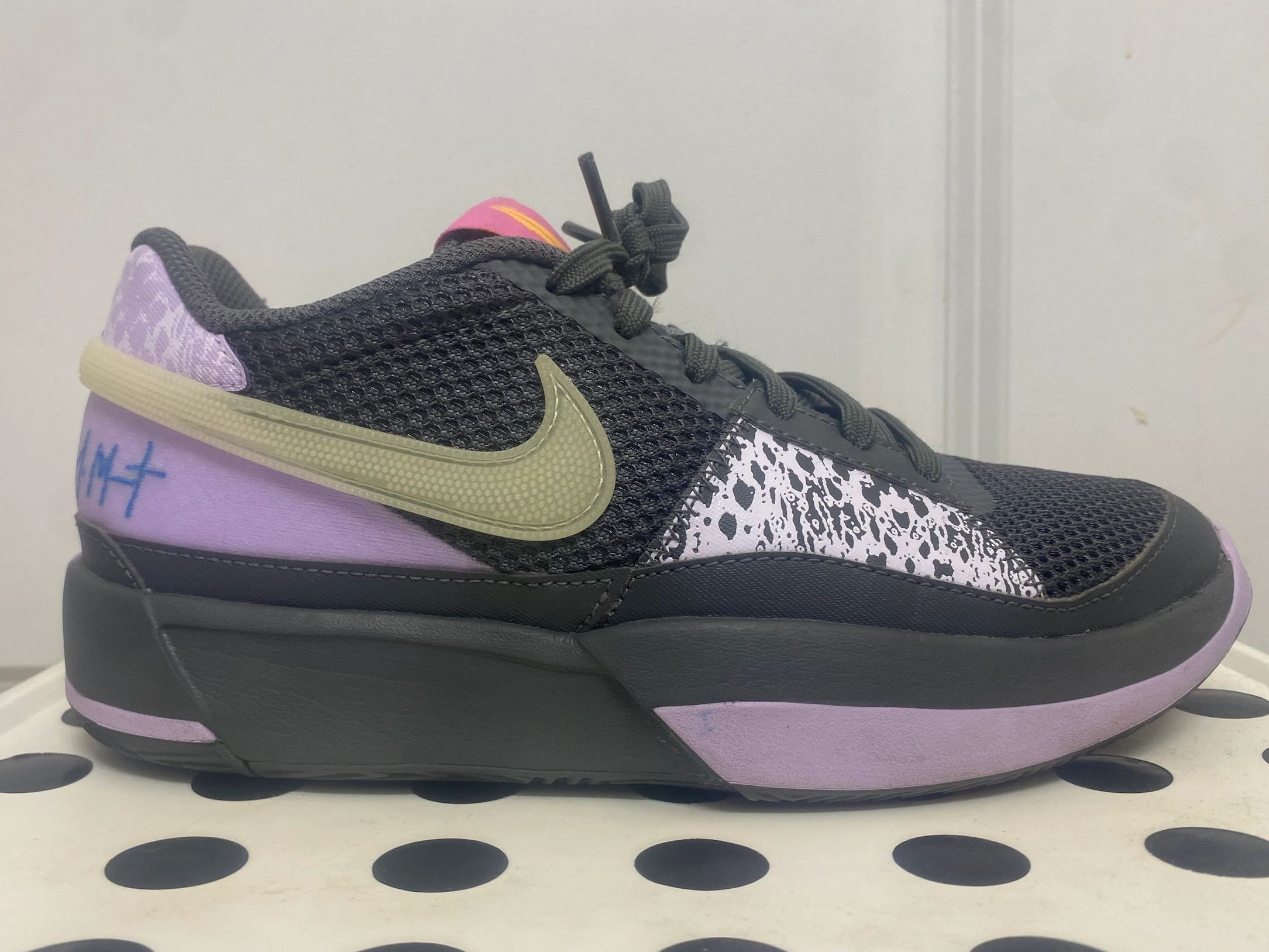 Stylish and performance-ready, the Nike Ja 1 in “Iron Grey/Glow Lilac-Bloom” is Ja Morant’s first signature sneaker — built for speed, bounce, and boldness. This grade school (GS) pair features a sleek iron grey base with lilac and bloom pink accents that add personality on and off the court. Worn once with no defects.